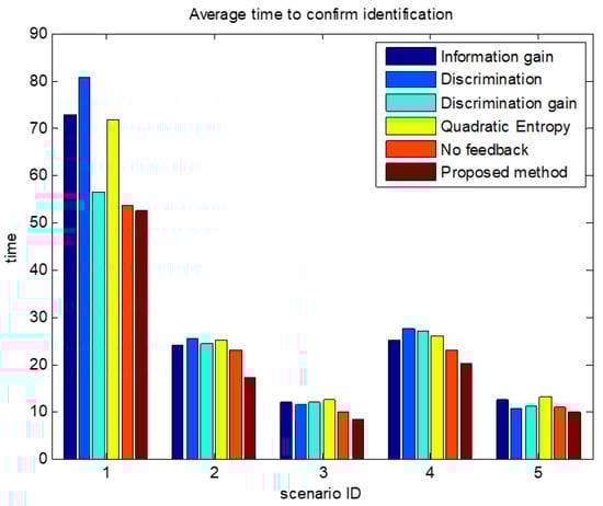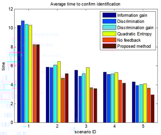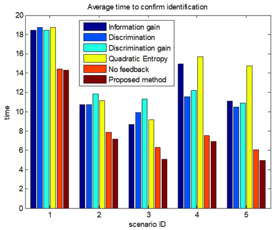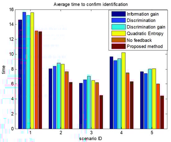 The comparisons of average confirmation recognition time based on various algorithms under the five simulation conditions are shown in Figure 11, Figure 12, Figure 13, Figure 14 and Figure 15. It can be seen that the average confirmation–recognition time of the proposed method is shorter than other methods in different scenarios, indicating that the proposed method achieves the purpose of shortening the target recognition–recognition time.