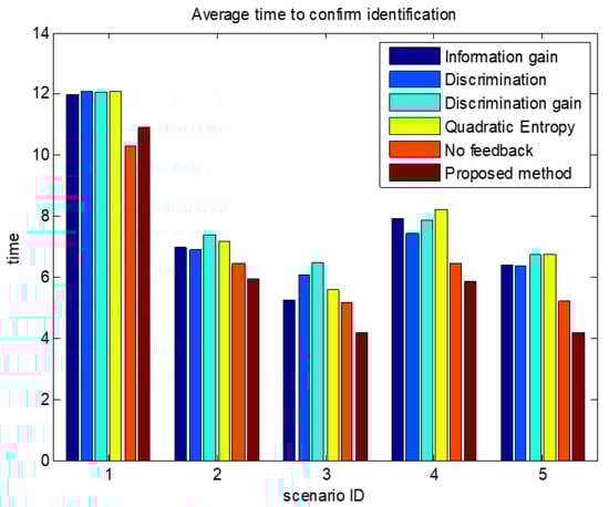 To verify the effectiveness of the proposed method that feedbacks the global identify results to local classifiers, we change the method of predicting the recognition result of basic sensors in step 3 of the target recognition process in Section 3.3 from Equation (14) to Equation (13), called the feedback-free confirmation recognition target-first sensor management method. It can be seen from Figure 11, Figure 12, Figure 13, Figure 14 and Figure 15 that the feedback-free confirmation recognition target-first sensor management method has inferior performance than the method in this paper, but it is better than the methods based on information gain, discrimination, discrimination gain, and quadratic entropy gain, which indicates that the effectiveness function based on information entropy and confirmed identification threshold is better, and the global fusion recognition result feedback local classifier target recognition prediction method can predict the recognition result more accurately, thus further shortening the recognition confirmation time.
