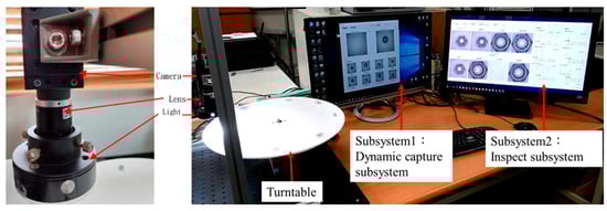 The detection equipment in this thesis is divided into three parts. As shown in Figure 1, the camera is an industrial camera and a turntable with a rotation speed of up to 0.6 m/s is used to simulate a conveyor belt or turntable. Subsystem1 is a dynamic capture, and the second subsystem is nut geometric detection. For Subsystem1, the object would be automatically captured when it passes through the center of the screen, and then the real-time image would be displayed on Subsystem1, and the captured image would be sent to subsystem2 for geometric inspection.