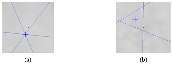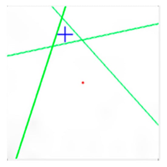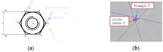 Parallel line detection was diagonally connected to determine the parallelism of nuts. One of the three pairs of parallel lines was taken from the midpoint as a start point, then to the endpoint of each pair, and finally back to the midpoints. These three pairs formed three lines. Two findings were shown when the three lines intersected at one point. First, as shown in Figure 6, the area of the triangle should be measured if the three lines have no intersection point. If the triangle area exceeds the threshold, the parallelism (of the nut) is not good. If the area is a regular hexagon, the distance between the opposite corners and the opposite corners is equal. If the distance between the opposite corners is equal, the lines will intersect at the center of the nut. If they are not equal, a triangular area will be formed in the center of the nut. The larger the difference in distance, the larger the triangular area.