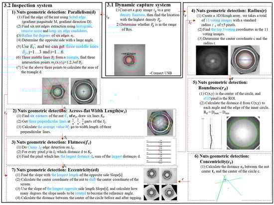 The geometry inspection of this study includes automatic image acquisition and pre-processing, parallelism detection, opposite side length detection, flatness detection, diameter, roundness detection, concentricity detection, and eccentricity detection, as shown in Figure 3.