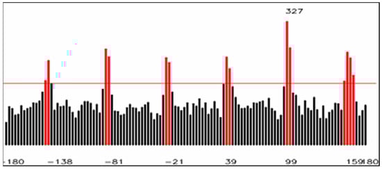 is the gradient magnitude. is the gradient’s direction. As shown in Figure 4, the gradient magnitude ranges from 0 to 255. To remove noise in and , a gradient magnitude threshold of = 50 was set. Any point p in and , was removed when Next, a hexagonal nut has six edges, so there would be six peak values of gradient direction. The figure of Magnitude-direction was plotted as a histogram , x-axis: the gradient direction was θ, and the range was −180 to +180 degrees, with 3 degrees per bin. The y-axis shows the number of points with a gradient direction of θ. We kept the six sides and removed non-edge pixels. Next, we set the maximum value of as , and remove the number of points with gradient direction less than . Therefore, we could obtain the angle of the six edges of one nut.