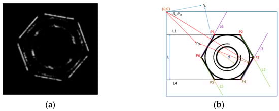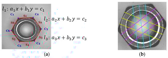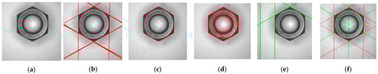 The purpose of conducting the line inspection is to obtain detailed parameters related to the edge of the nut. To achieve high precision and detailed information concerning edge detection, three items were examined: parallelism, opposite edge length, and flatness. The automatically acquired pre-processed image was used for the line inspection. The first objective was to obtain the six edges of the hexagonal nut using Sobel edge geometry inspection [33], which is used to calculate the gradient magnitude and the gradient direction :