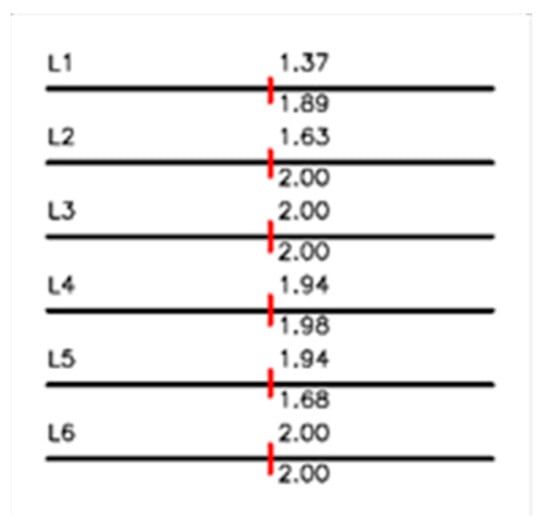 As shown in Figure 7, i = 1~3 in the line segment ; the coordinate points of the 1/4, 2/4, and 3/4 positions were found on the line segment ; and the vertical line segment can be found in the straight-line equation . The slope of , which is the slope of the vertical line, is , which can be obtained by the equation of B: y = . Since is perpendicular to , the relationship is , . A vertical line can be drawn on the coordinate points of 1/4, 2/4, and 3/4 on the line segment . By calculating the average value of three perpendicular lines, the quality of a cross-flat width length can be considered good if , i = 1…3 are close.