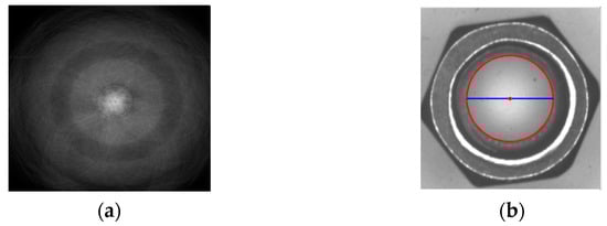 The diameter that determines whether the nut is easy to loosen or seize is shown in Figure 9. The Hough circle is used to detect the diameter of a circle. However, the Hough circle has the problem of taking too much time to detect the circle. To reduce the time of geometry inspection, fixed specifications were applied to reduce the Hough voting geometry inspection time. To obtain the required radius and center coordinates accurately, the edge detection result from Section 3.2.3 was used to draw a circle. Each pixel point on the circle was seen as the center point, with the bore radius r ± 5 pixels. Draw a circle around all pixel points in the image. The peak values of the 11 votes were compared, and the highest voting value r was used as the real radius. The top 3 peak values of this radius were then chosen to use a subpixel. Finally, a true circle center C (, ) graph was drawn.