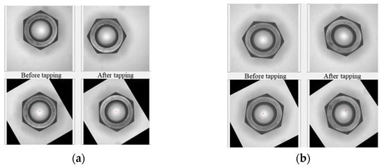 To calculate the displacement of the center of the circle before and after tapping, whether tapping would shift the nut’s center of gravity was investigated. Throughout the process, the datum of the captured image had to be consistent. As shown in Figure 12, regarding eccentricity, the change in the central coordinates before and after tapping needs to be noted. However, the images before and after tapping were different. Therefore, it was necessary to collect the datum for calculating the eccentricity first, and then transform the image into a consistent form based on the datum.