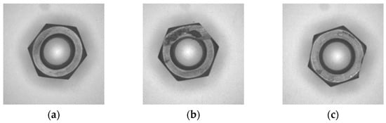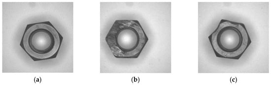 The geometry inspection method was tested and evaluated. The nuts were placed on the turntable/conveyor belt. Both normal nuts and abnormal nuts were mixed to simulate the actual production line. As shown in Table 2, we collected 50 normal nuts before tapping, 50 normal nuts after tapping, 24 abnormal nuts before tapping, and 20 abnormal nuts after tapping. The nuts were formed by press forging, and badly formed nuts were produced only when the production machine was faulty and the maintenance was negligent. The tapping machine team was requested to produce abnormal nuts for the test, using grinders to wear the edges and bearing surfaces and pliers to flatten the nuts. Nuts with three types of defects before tapping are shown in Figure 13, and nuts with three types of defects after tapping are shown in Figure 14. The defective nuts are divided into three types: line defects, round defects, and flat defects. In this study, the purpose of using nuts with three types of defects was to compare the results caused by different types of nut damage.