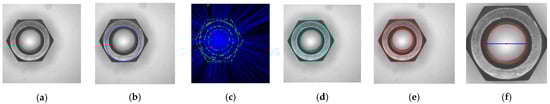 In order to quickly obtain the information on the 6 sides of the nut, missing edges and false information had to be avoided. For example, in Figure 15, the Hough line probabilistically did show spurious edges, and the edges found were incomplete. This work proposes to optimize the Hough line so that the program will not be affected by light and shadow when detecting the 6 edges of the nut. The detected sides were divided into 3 groups, and three distances were taken for each group to calculate the length of the opposite side. The drawn side was then overlapped with the outline of the nut to calculate the straightness. Regarding circle diameter detection, false circles, which are not the target circle, may have been detected due to light and shadow. For example, Taubin may find a circle that is not the target, and the borehole information found may also be affected by light, shadow, and threads. Therefore, we improved the Hough circle and used weight to reduce the influence of the thread, as shown in Figure 16. We used the circle center coordinates to calculate the roundness. The concentricity is the distance between the circle center and the nut center, and the eccentricity is the change in the position of the circle center before and after tapping. We have improved the errors and false detections of the edge and bore when detecting the nut. To detect the nut faster than the nut manufacturing speed, the rest of the inspection only needs information on the nut edge and bore. We propose nut inspection items that do not require visual or contact instruments and hope that these inspection items can contribute to improving the quality of maintenance nuts.