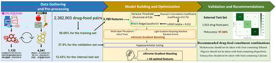 The workflow of our study, which is exhibited in Figure 1, comprised three key steps: (i) Data gathering and pre-processing, (ii) Model building and optimization, and (iii) Validations and recommendations. In the first step, we extracted the data from DrugBank [39] (version 5.1.7) and FooDB (https://foodb.ca/, accessed on 29 August 2022) (version 1.0) databases. During this step, we processed the data to reduce the number of drug and food constituents examined to 1133 and 4341, respectively. In the second step, we applied four feature selection methods to pick up eighteen optimal features among 3780. We applied five algorithms to the training set with eighteen features and then fine-tuned the parameters to find the best model. The last step evaluated the performance of our model on one external test set from the previous study [5]. Finally, we extended our study to predict some adverse DFIs of various drugs encountered in clinical practice.