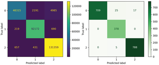 We applied four ML algorithms and one neural network architecture to our training set: RF, XGBoost, ET, LGBM, and MLP. For each classifier, we implemented a five-fold CV to evaluate their performances. In Table 1, XGBoost reported the highest performance, achieving a mean accuracy of 96.75% (±0.05%). The lowest accuracy was seen on MLP (95.89% ± 0.02%), whereas LGBM, RF, and ET gave a score ranging from 95.89% to 96.71%.