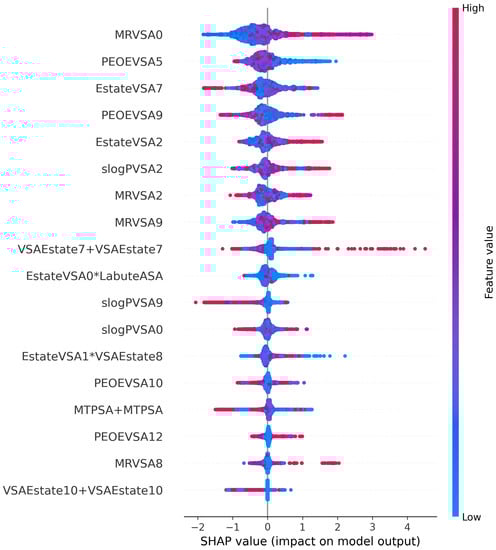 Accordingly, the red dots of MRVSA0, EstateVSA2, MRVSA9, MRVSA8 and blue dots of PEOEVSA5, MTPSA+MTPSA, VSAEstate10+VSAEstate10 gather on the right side of the x-axis, indicating that the high values and low values of these features, respectively, direct the model in recognizing the non-significant DFIs. High PEOEVSA5, EstateVSA7, slogPVSA9, MTPSA+MTPSA, and low values of MRVSA0, MRVSA9 help detect the negative DFIs. The positive DFIs are identified by the increasing values of PEOEVSA5, EstateVSA0*LabuteASA, EstateVSA1*VSAEstate8 and the decline of PEOEVSA9, EstateVSA7, EstateVSA2, slogPVSA9, MRVSA2, VSAEstate7+VSAEstate7, slogPVSA0, PEOEVSA12.