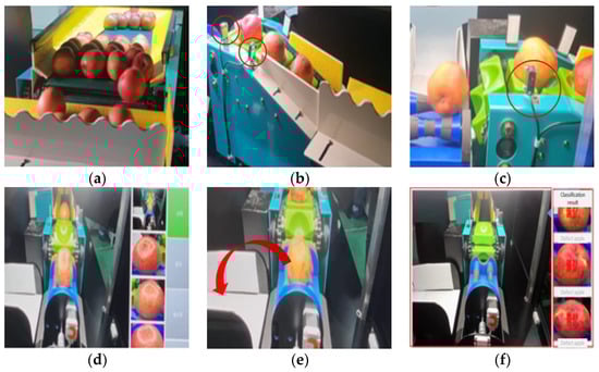 The process of the apple sorting system: (a) apple supply conveyor; (b) transfer conveyor belt; (c) object detection sensor; (d) processing of CNN classifier; (e) stepping motor; (f) monitoring of classifier result.