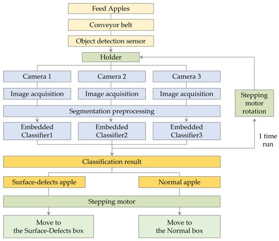 The overall process of the apple sorting system is depicted in Figure 1a–f. Apples are loaded onto the conveyor (Figure 1a) and placed into individual holders for scanning and classification (Figure 1b). The apples detected by the object detection sensor roll towards the holder and settle into place (Figure 1c). The process of apple insertion into the holder is controlled by the object detection sensor, and it is indicated in red circles in Figure 1b,c. Once in the holder, the apple is immediately captured by the cameras, and the obtained images are processed through the CNN classifier deployed on each embedded board for inference. The apple is then rotated once, and the same inference is performed for the captured images on the other side of the apple (Figure 1d). More information about the rotation and camera structure can be found in the description in the Holder section. Finally, the stepping motor moves the apple to the box according to its classification results in the direction of the red arrow (Figure 1e), and the results can be monitored (Figure 1f). To aid in understanding, the workflow of the system is depicted in Figure 2.
