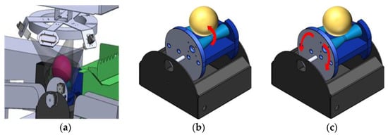 In the holder section, an apple detected by the object detection sensor rolled into the holder, and three cameras simultaneously captured each of the three sides (Figure 3a). The holder then rotated the apple 180 degrees in the direction of the red arrow using a rotation mechanism based on the principle of rotational friction force generated by rapidly running the motor of the internal roller (Figure 3b). After rotation, there was a two-second waiting period for the apple to stabilize in the holder, which prevented significant motion blur from the camera during rotation and enhanced data quality for classification. Once the apple had stabilized, all three cameras captured its three sides again, resulting in six images of the apple’s surface: three before rotation and three after rotation. The three images before the rotation were immediately classified by the CNN classifier on the embedded boards. The classification results of the three images after the rotation were obtained by the same process. After obtaining a total of six classification results, if even one image detects a surface defect, the external stepping motor of the holder rotated 45 degrees to sort the apple into the box (Figure 3c). Therefore, this is to rotate to the Surface-defects box as indicated by the red arrow on the left, and rotate to the normal box as indicated by the red arrow on the right.