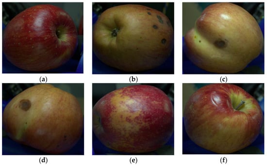 Normal and surface defects apple cases: (a) Normal; (b) Physiological disorder; (c) Malformation; (d) Pest; (e) Russeting; (f) Scratch.