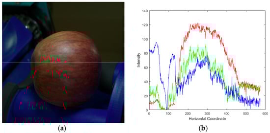 Step 2. Histogram-based complete apple segment: We apply a Gaussian blur filter with to the image to remove noise for better apple region estimation. Additionally, uses a color-based approach to estimate the apple position. Thus, we assume that R, G, and B are matrices of red, green, and blue channels in . Therefore, it is possible to check the intensity of the R, G, and B pixels at the horizontal coordinates, aligned with the center coordinate values of the apple, as shown in the sample apple image in Figure 6a, which is depicted as shown in Figure 6b. And for each color, the red line stands for R, the green line for G, and the blue line for B.