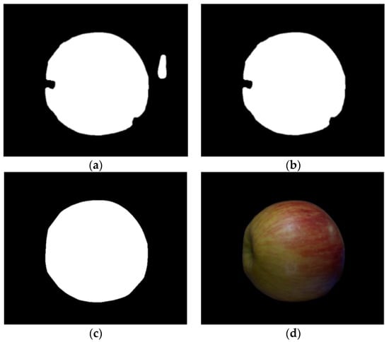 As shown in Figure 6, to remove the small blob created outside the apple area and to connect the area that is not completely closed, the apple boundary is smoothly filled using morphology with an ellipse kernel of size 9 × 9, and the apple boundary is selected the largest area among the filled areas. Then, if only the outer apple boundary is connected by applying the convex hull algorithm, only a perfect apple region is finally extracted. The finally extracted apples are as shown in Figure 7d.