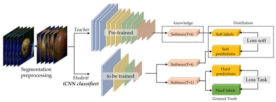 By minimizing the KL divergence between the soft-target distribution and the ground truth distribution, the student model is encouraged to learn from the teacher model’s knowledge as shown in Equations (9)–(11). Here, () is the logit value of the teacher model, and ) is the logit value of the student model in Equation (9). In this way, KD can help the student model achieve better performance than it would have otherwise by leveraging the knowledge contained in the teacher model.
