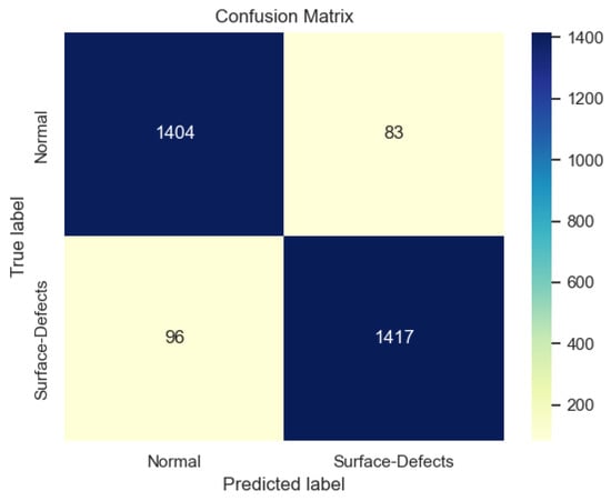 Therefore, using the student model (ResNet18 + w/KD-R8) obtained in the end, the confusion matrix for the test set in Figure 11 is as follows. The Recall value of the model is marginally higher than the Precision value, indicating the model prioritized not to miss any surface defects samples but misclassified some normal samples as surface defects.