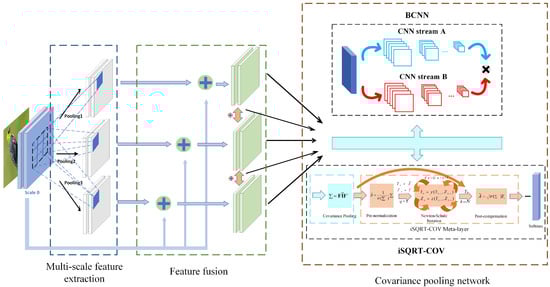 The framework of our method is shown in Figure 1. The network architecture includes three modules: (1) multi-scale feature extraction, (2) feature fusion, (3) and covariance pooling network. The multi-scale feature extraction module is achieved through different pooling methods and different pooling kernel parameters. The feature fusion module fuses the multi-scale feature maps through additive fusion and sends them to the baseline networks (VGG, ResNet, and DenseNet). The covariance pooling module feeds the fused feature maps into the covariance pooling network for information fusion in the second-order dimension. For a better understanding, the principles of two existing covariance pooling methods (BCNN and iSQRT-COV) are briefly described in Section 3.1. Section 3.2 specifies how the algorithms in this paper are implemented through equations and textual exposition.
