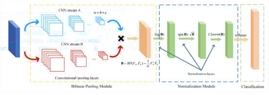 The framework of BCNN is illustrated in Figure 2. The BCNN network involves three steps: (1) Feature images are fed into two CNN feature extraction networks, and the feature vectors generated by the two CNN streams are used to compute the outer product of the corresponding position elements, also known as the bilinear pooling process. (2) The feature matrices are normalized through logarithmization, square root, and L2 normalization. (3) The fused features are then fed into the classifier to obtain the classification labels. BCNN can be represented by a quaternion for ease of understanding, where and denote feature extraction functions based on CNNs, denotes the bilinear pooling function, and C denotes a classification function. Given an input image I, the extraction of features using CNN to produce a feature map can be expressed as: