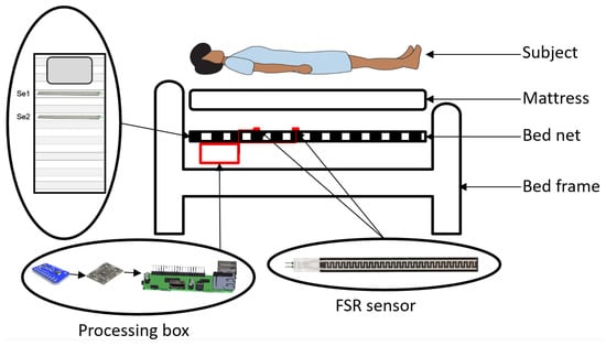 We utilized two FSR strip sensors of and on the bed net and under the mattress to cover subjects’ thoracic and abdominal regions, respectively, measuring the cardiorespiratory parameters. The sensors are deployed horizontally, covering approximately 62 cm of the bed. Sensors are connected to the pre-processing boards, ADC over the IIC board, and eventually linked to Raspberry Pi 4B via wire (see Figure 1).