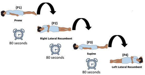 We used SOMNO HD eco PSG (SOMNO medic GmbH, Randersacker, Germany) to record the reference data. We recorded the respiratory (thorax and abdomen) and ECG signals at 32 Hz and 256 Hz, respectively. The belt was tightened to a comfortable level, and ECG electrodes were disposable. Data from the FSR strip sensors were captured at a sampling rate of 150 Hz. The subjects were instructed to lie down on the bed in four different positions: prone (), right lateral (), supine (), and left lateral (). The experiment started with the individuals prone and ended with the left lateral position in a counterclockwise rotation of the subjects. The data measurement lasted 80 s in each position. We gave subjects five minutes to relax before collecting data. During the data collection, the subjects were instructed to behave normally with the least amount of movement. They were nevertheless advised that in the event of an inconvenience, the experiment would be stopped (see Figure 2).