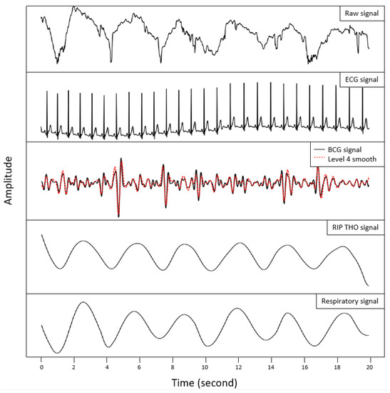 Hence, the recent advances in technology have led to the development of new approaches to measure cardiorespiratory parameters during sleep using wearable devices, e.g., pneumobelt sensors [26], smartphone apps [27], video monitoring [28], infrared thermography [29], and ambient sensors [30] to overcome the cumbersome of using PSG. However, interfering with sleep or, to some extent, obtrusiveness, privacy violation and intrusiveness, lack of reliability and accuracy of measurements, complex systems, and positioning uncertainty are some of the reasons transitions in the approaches to further simple, unobtrusive, noninvasive, and reliable measurements [31] are necessary. With advancements in sensor technology from one side and signal processing techniques from the other, methods such as ballistocardiography (BCG) attracted more attention. It is a noninvasive method of measuring the mechanical forces generated by the heart’s contraction during each heartbeat [32,33].