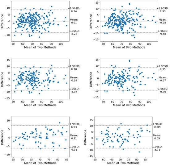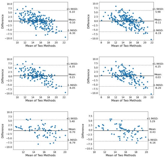 From the LoA point of view, has a better LoA than in all three categories. The overall LoA of in all positions is in the range of [−8.23, 8.24], [−6.31, 6.93] for females and [−8.90, 8.70] for males (see Figure 5 and Figure 6).