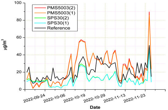 For the purpose of this study, measurements from the 15th of September 2022 to the 27th of November 2022 were carried out. These data formed a dataset composed of the daily averages of PM10 concentrations resulting from the measurements of the four LCSs involved in the study (hereafter named “PMS5003(1)”, “PMS5003(2)”, “SPS30(1)”, and “SPS30(2)”) and the fixed reference station of ARPA Puglia (hereafter named “reference”). In the period indicated above, ARPA Puglia did not provide data for ten dates due to the maintenance of the instruments or other unknown issues, while the data recovery percentage was close to 100% for each sensor. For this reason, we excluded the records of the database lacking reference measurements from the computation of the performance indicators.