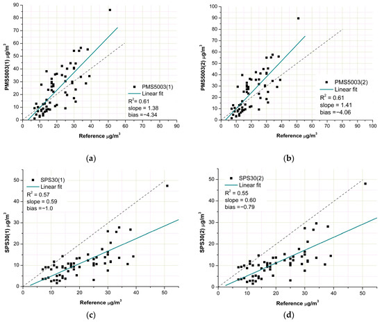 (a) PMS5003(1); (b) PMS5003(2); (c) SPS30(1); (d) SPS30(2). Comparison between the four copies of the PM sensors involved in this research and the reference device. The solid line represents a linear regression fit computed through the ordinary least squares method, while the dashed line indicates the 1:1 reference line. In the corners of the figures, the statistics are reported. The slope and bias are related to the slope and the intercept of the linear fit.