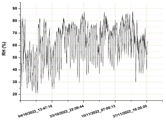 As explained earlier, an algorithm to correct the negative effect of humidity was applied to the sensor measurements to evaluate potential improvements in their performance. For this reason, the relative humidity (RH) was measured and logged along with the other sensor data to compose the final dataset. Figure 7 shows the levels of relative humidity registered during the period of the experiment.