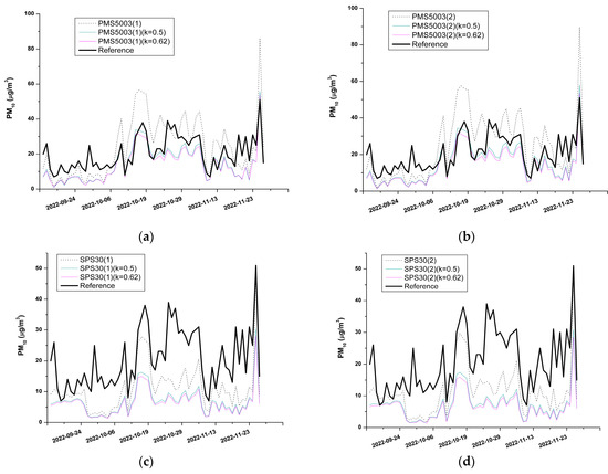 (a) PMS5003(1); (b) PMS5003(2); (c) SPS30(1); (d) SPS30(2). Time series of the sensor measurements compared with the reference device (thick black line). The dotted line is relative to the sensor data without the application of Equations (6) and (7). The straight thinner lines indicate the sensor measurements after applying the correction to include the humidity effect. The labels k = 0.5 and k = 0.62 indicate the different values of the “k” parameter in Equation (7).