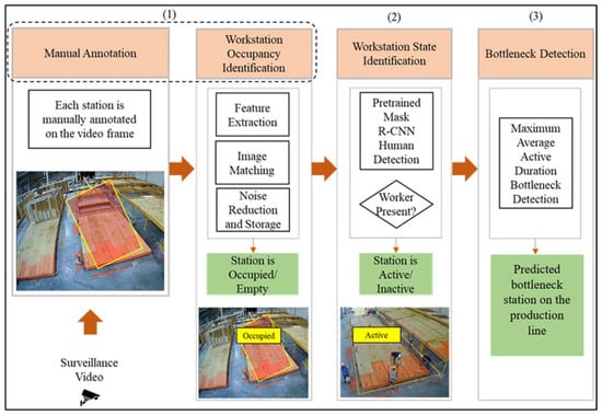Figure 1, the objectives of this study are: (1) workstation occupancy identification: to identify if the workstation is occupied by a modular unit and classify the station as occupied or empty; (2) workstation state identification: to identify if workers are present at the workstation and classify the station as active or inactive, and (3) bottleneck detection: to identify the bottleneck workstation.