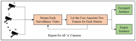 Figure 2, the user is required to annotate two instances for each station based on whether there is a modular unit present in the Region of Interest (RoI) or not. Subsequently, two ground-truth RoIs are created for each station and will be used to classify the station in the rest of the video as occupied or empty. Thus, n stations require 2×n ground truth RoIs. This pipeline is shown in