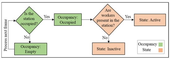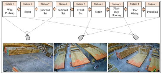 8] proposed a vision-based monitoring method that detects the crane and the workers in a single station and updates the parameters of a finite state machine to track the progress of work. However, their scope of work is limited to a single station, does not provide the information needed to identify the bottlenecks on the production line, assumes the station is already occupied and work has started, and is not adaptable to changes in the layout of the factory. More recently, Park et al. [