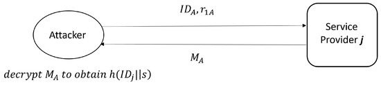 As mentioned in Section 2, an attacker may have a legitimate identity. Even if obtains the master key K of the service provider, cannot pretend to be another consumer in the improved protocol, since is stored in during the registration phase, and generated by each consumer is different. Although can be obtained when decrypting with key K, cannot be calculated without or K at the same time. In addition, still does not store ’s ID so it still meets ’s non-traceability.