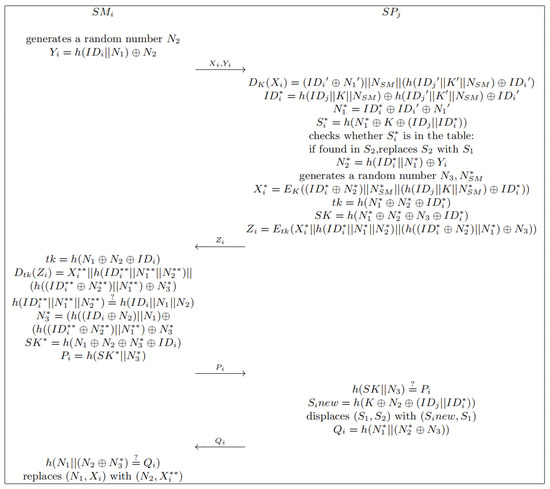 To avoid the above insider attack, different SMs should have different authentication information. Note that the anonymity of the SM cannot be destroyed when distinguishing different SMs. Based on this analysis, this section presents an improved protocol, which involves two phases: a registration phase, and an authentication and key agreement phase. Table 2 lists the notations used in the improved scheme.
