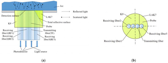 Schematic diagram of fiber-optic ice sensor structure. (a) Schematic diagram of the structure; (b) fiber arrangement diagram.