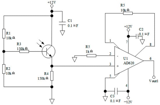 The photoelectric conversion and amplifier circuit are key components of the fiber-optic ice sensor, as shown in Figure 2. For all three receiving fiber-optics, the conversion and amplifier circuits are the same. The photoelectric converter is a high-sensitivity silicon photoelectric triode with module LSSPD-1.2. The terminal of each RF is connected to the photoelectric triode. The preamplifier chip module is AD620. The converted signal is input into AD620 to obtain a differential amplification output signal. The whole circuit is powered by a DC-regulated power with module QF1722M-2. Therefore, the received light intensity is a function of the output voltage.