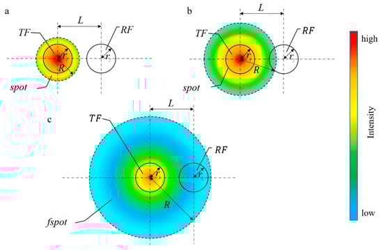 In the glazed ice case, when the ice thickness is small, there is no overlap between the reflected light spot and the end face of the receiving fiber, as shown in Figure 4a. Therefore, the received light intensity of the receiving fiber is 0. With the increase of the ice thickness, the reflected light spot begins to overlap with the receiving end face of the receiving fiber (Figure 4b). The overlapping area of the reflection spot and the end face of the receiving fiber are defined as the effective receiving area. The effective receiving area and the received light intensity increase with the increase of the ice thickness. When the ice thickness continues to increase, the receiving end face of the receiving fiber is completely covered by the reflected light spot (Figure 4c) where the received light intensity is almost maximum. After that, the light spot continues to increase, and the effective receiving area does not increase. However, the light intensity of the effective receiving area decreases with the increase of the ice thickness. The trend is shown in Figure 5a. Because RF1 is closer to TF than RF2, the received light intensity is bigger. The simulation results can be seen in Supplementary Materials.