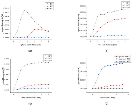 Relationship between received light intensity and ice thickness. (a) Received light intensity curve at glazed ice; (b) received light intensity curve at rime ice 1; (c) received light intensity curve at rime ice 2; (d) RF3 reception curves of different ice types.
