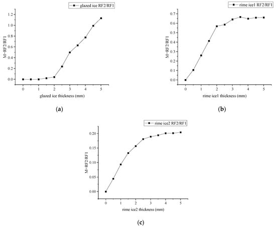 To detect ice thickness, we calculated the light intensity modulation function, which is defined the received light intensity in RF2 divided by that in RF1, as shown in Figure 6. Figure 6a shows that the measurement range of glazed ice thickness is from 1 to 5 mm. Figure 6b,c show the measurement range of rime ice thickness is from 0.5 to 5 mm. Figure 6 shows that the light intensity modulation functions of the three types of ice show great differences, with the curve of glazed ice showing a slow growth followed by a sharp growth, and rime ice showing a sharp growth followed by a slow growth. Additionally, the sensitivity of the rime ice 2 curve is lower than that of the rime ice 1.