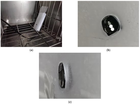 Low-temperature icing test: (a) fiber-optic ice sensor installation; (b) front view of fiber-optic ice sensor probe; (c) side view of fiber-optic ice sensor probe.