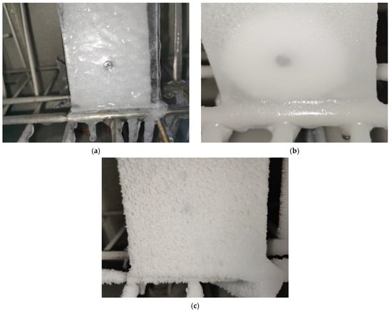 Three typical ice types for the low-temperature icing test: (a) glazed ice for −5 °C; (b) rime ice for −20 °C; (c) rime ice for −40 °C.