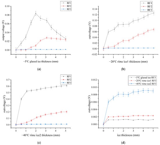 Figure 9 shows the experimental correlation between the output voltage and ice thickness, which accords well with the simulated ones. For the glazed ice, RF1 and RF2 voltage output curves show a trend of increasing at the beginning and then decreasing. For the rime ice, RF1 and RF2 voltage output curves show a trend of rapid increase at the beginning and then slow their increase. The output voltage in the RF3 case differs significantly for different ice types. The experimental results can be seen in Supplementary Materials.