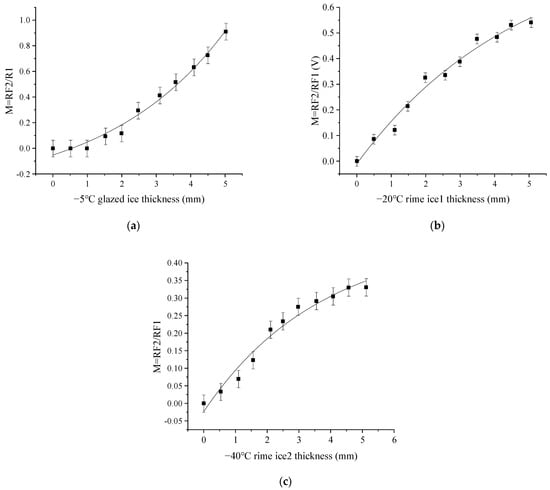 Similar to the simulations, we define the light intensity modulation function (M) in which the measured output voltage for RF2 is divided by that for RF1, as shown in Figure 10. The relationship between M and h was obtained by fitting the data of the voltage and the icing temperature. The fitting polynomial equations are shown in Equation (4).