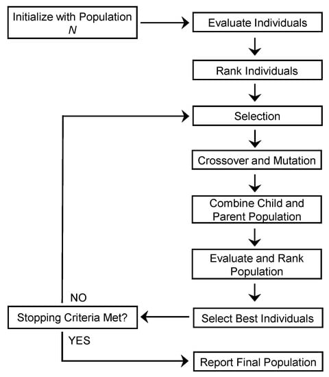 The algorithm starts with an initial design variable population of size N. In order to ensure a thorough exploration of the whole design space, the population size was set to 200 in this work. Next, the initial population is evaluated to obtain the respective objective function values (fitness values). The evaluated population is then ranked based on the fitness values, and the best individuals among the initial population are selected as a parent population. In this work, the best half (50%) of the whole population is selected as the parent population, while the other half is discarded. By means of genetic operators (crossover and mutation), a child population is then created from the parent population and both child/parent populations are merged to make a single extended population. For this work, the crossover fraction and mutation rate are set to 0.8 and 0.05, respectively. At this point, all the individuals of the extended population are evaluated in order to obtain the corresponding objective functions’ values associated with them. Lastly, the individuals of the extended population are ranked and sorted on the basis of their non-dominance level. The best individuals from the sorted individual sets are selected as the parent population for the next iteration and fed back to genetic operators. This iterative cycle continues until the stopping criteria is met, i.e., when the average relative difference between non-dominated sets of two consecutive iterations falls below a certain value (1 × 10−4 is used as a threshold value). A complete flowchart of the NSGA-II algorithm can be viewed in Figure 2.