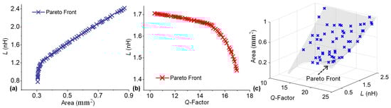Non-dominated solution sets for RF-MEMS inductor optimization problem: (a) inductance vs. area; (b) Q-factor vs. inductance; and (c) Q-factor vs. inductance vs. area.