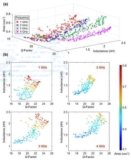 In the above-described optimization scenarios, the frequency was fixed to 5 GHz. Nevertheless, the proposed methodology can easily be tailored to achieve the broadband optimization of RF-MEMS devices. Since the frequency is taken as an input variable in this case study (Table 1), the developed surrogate models essentially describe the frequency-dependent input–output behavior of RF-MEMS inductors. That is to say, following the development of frequency-dependent surrogate models, the inductors can be quickly optimized for various operating frequencies by directly using these frequency-dependent surrogate models. To further illustrate this idea, we optimized the inductor surrogate models at four different frequencies (1, 2, 3 and 4 GHz) and extracted the corresponding pareto optimal points, as plotted in Figure 5. These intrinsic trade-off curves, related to the inductor geometry and relevant performance parameters, are difficult to extract and optimize manually. Hence, information on the optimality of such trade-offs is highly valuable to RF designers.